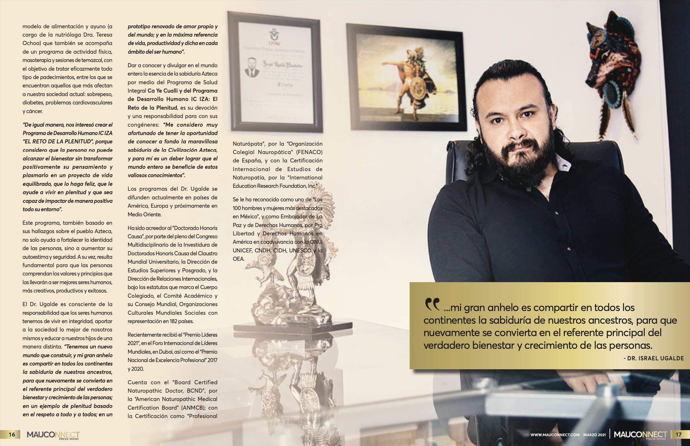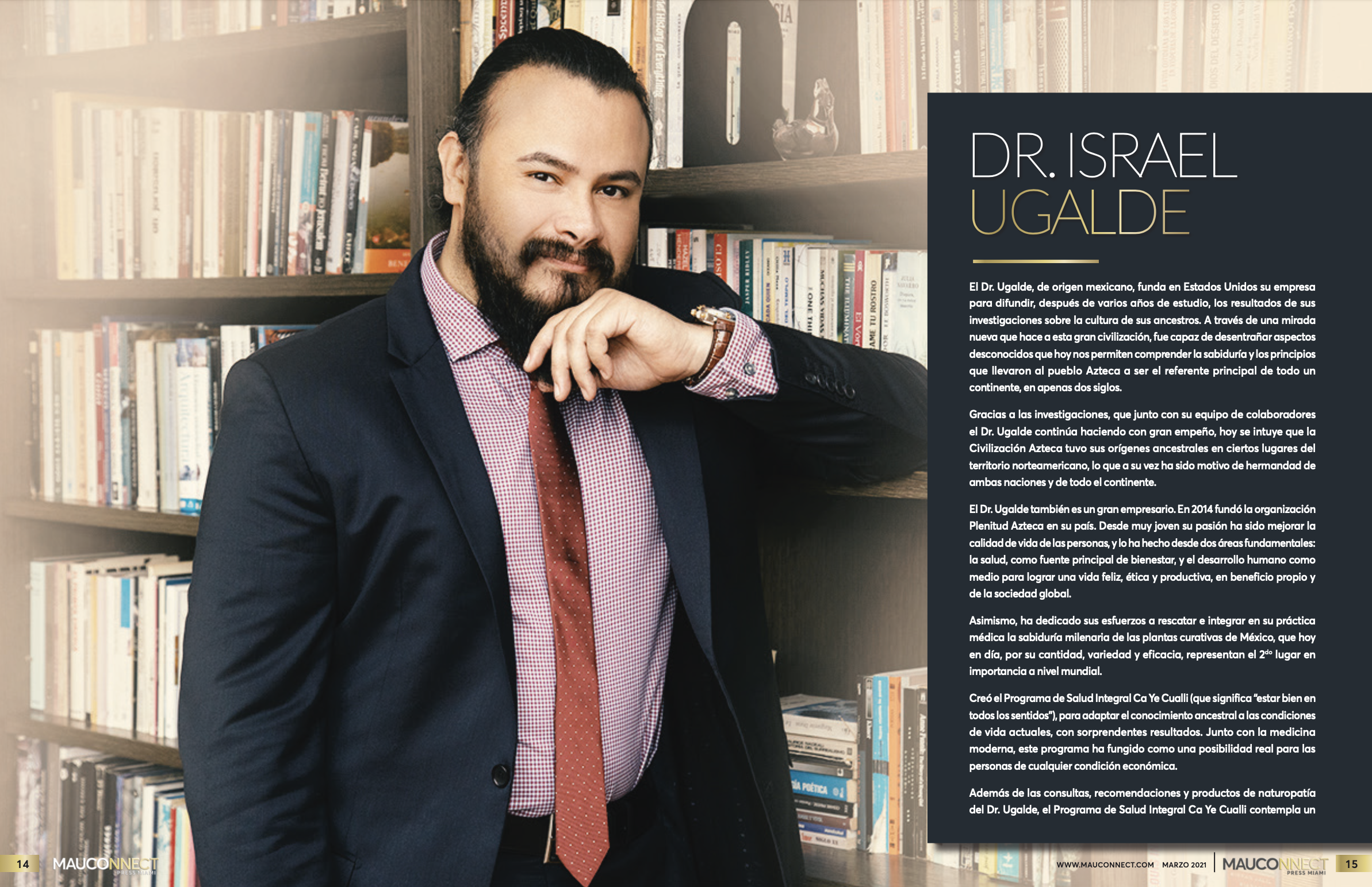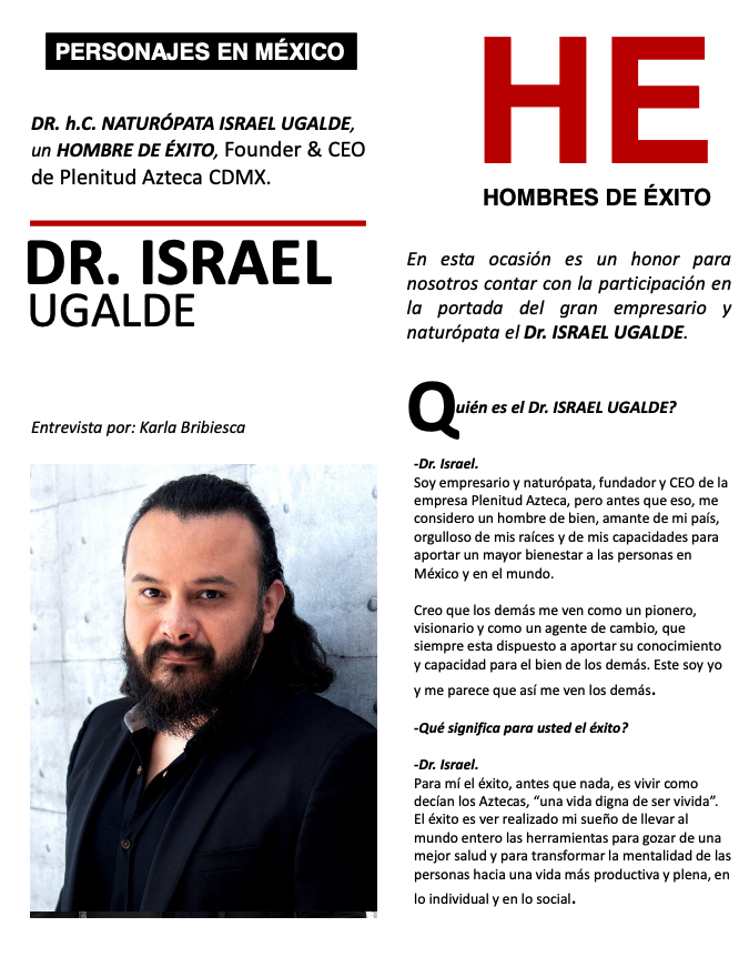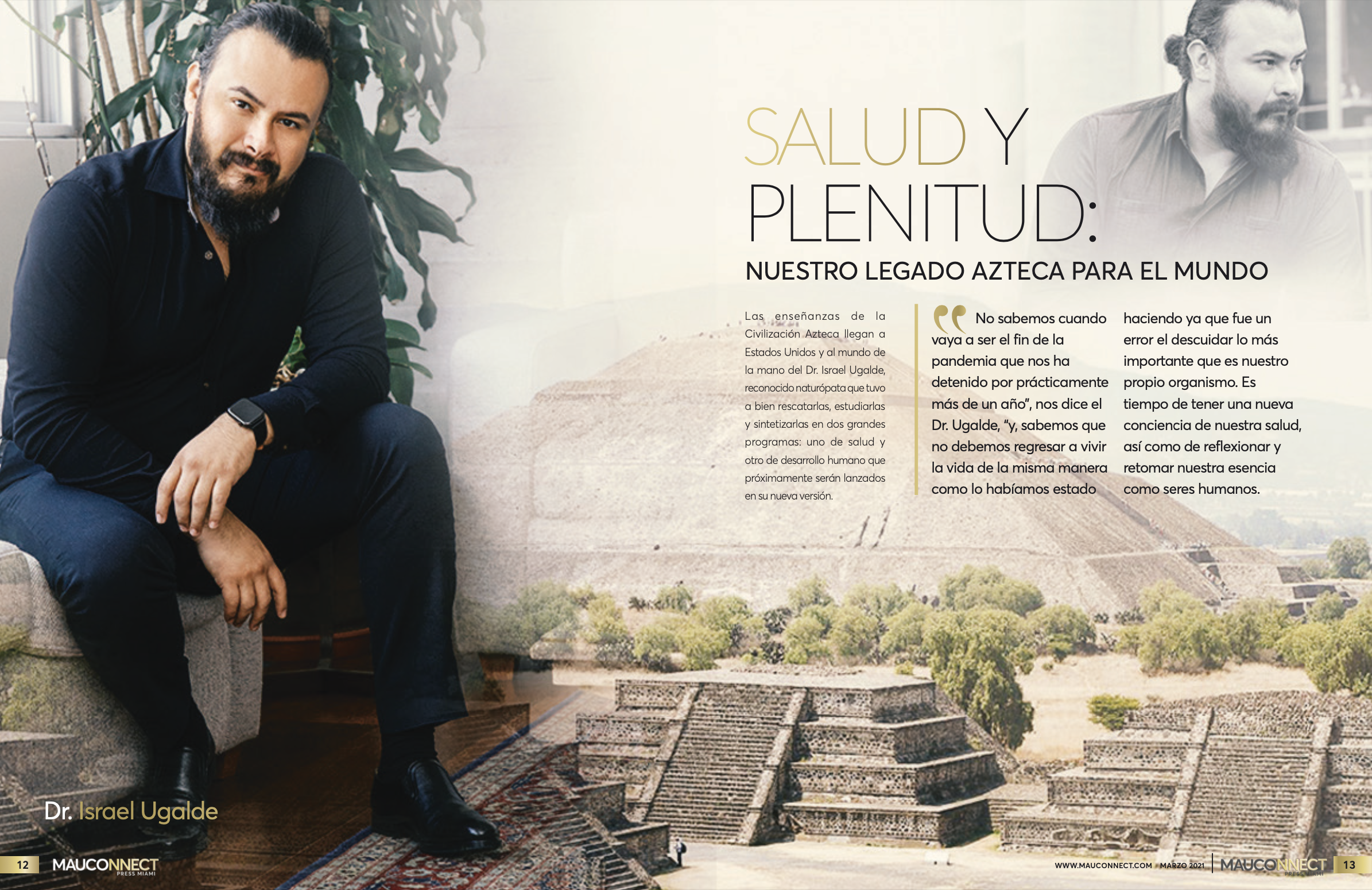 The article explores Aztec naturopathy through the work of Dr. Israel Ugalde and his company Plenitud Azteca. The company promotes holistic health based on pre-Columbian herbalism, diet, exercise and Aztec fasting. Ugalde has received awards for his work, including Doctor Honoris Causa.